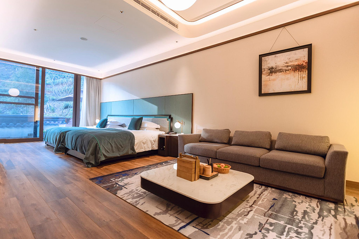 龙倚楼里的房间装饰的风格典雅,超大的落地穿,使得房间的光线很好,窗外有一处露天阳台,房间面积很大,设施齐全充满了科技化。