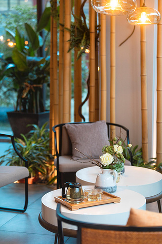 右手边是一处竹影吧,可以在办理入住的时候稍作休息,这里有中、西名茶,现磨咖啡,各国名酒及精美西点,也可以和朋友在这里喝喝茶,聊聊天,窗外的竹林,摇曳这斑驳的竹影,映照在硕大的落地窗上。