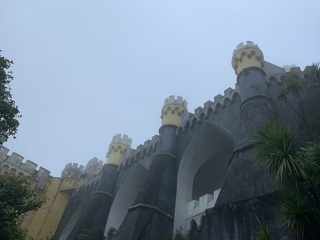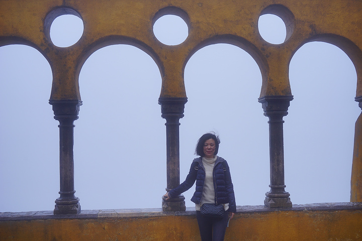 我们去的时候天气不太好,整座城堡笼罩在一片大雾中,很朦胧,有一种神秘的感觉。实际上阳光下的佩纳色彩艳丽,粉红色、红色和黄色的墙面和如发射火箭般的城堡顶层塔楼,使它看上去像一座乐园式的城堡。