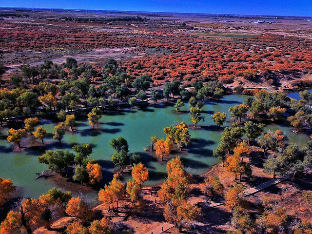 当金秋的风吹到了大漠,千年的胡杨林接受生命的洗礼,一夜之间如约换色,披上了耀眼的金黄。这是荒野精灵大漠胡杨与每个秋天的相约,隆重而热烈。
