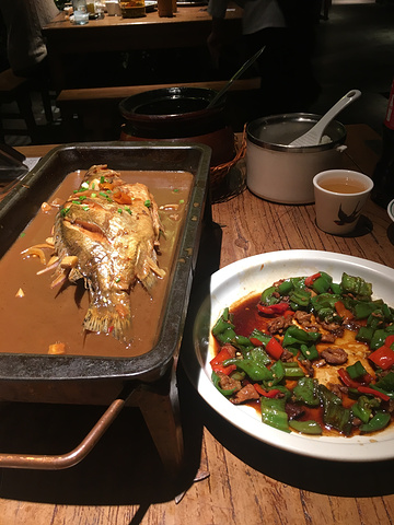 店主人推荐的这家饭店,是家老店,臭鳜鱼的味道不错,不是臭的,吃起来刺很少,辣椒小炒肉特别下饭,只是老公吃不了辣,几乎都是我自己吃了、临江边的店,雨慢慢停了,吃完在江边散步,我们都想吟诗一首
