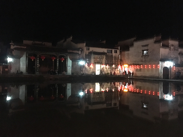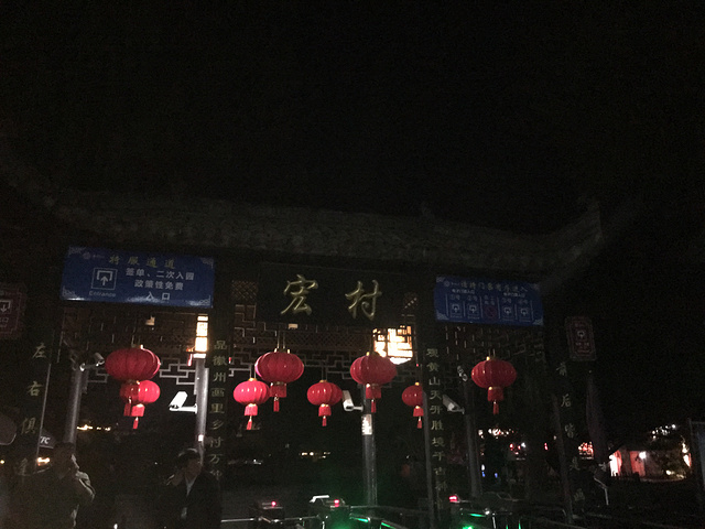 从黄山风景区换乘中心有直达宏村的班车,我们坐的最后一班,两个小时左右就到了,天已经黑下来