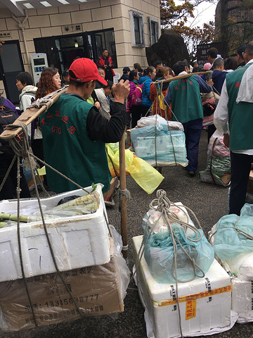 黄山的挑夫们都是从白鹅站开始艰辛的历程,一个担子上我看有挑四箱食用油,一箱四桶的话,重量应该是160斤,完全靠脚力,真是辛苦,不知道是在为谁负重前行