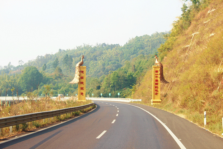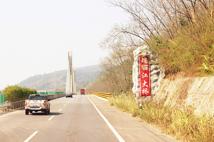 在车站边吃过饵丝作为早饭,8点40准时发车,抵达瑞丽的时间为中午十二点。前一半的路程一直在腾冲宜人的春色山道上前进,直到过了龙陵,进入高速,便进入了德宏傣族景颇族自治州,进入边境地区,休息站的安检越来越频繁和严格,路牌上也开始出现傣文。