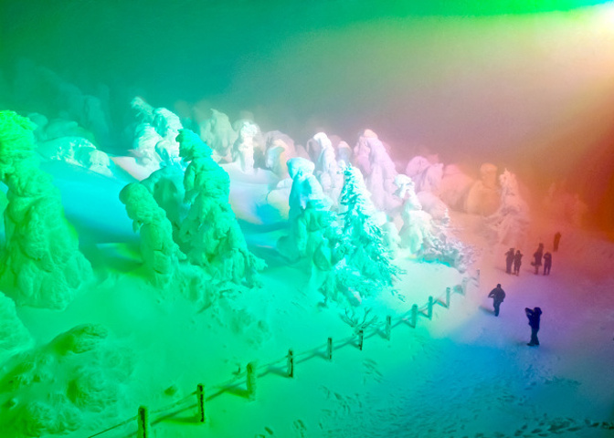 每年11月下旬到第二年3月上旬,这一地区的树木会被厚厚的冰雪包裹起来,形成形状千奇百怪的天然“雪雕”。这一奇异的景象被称为“树冰”。日本也叫“雪怪”。