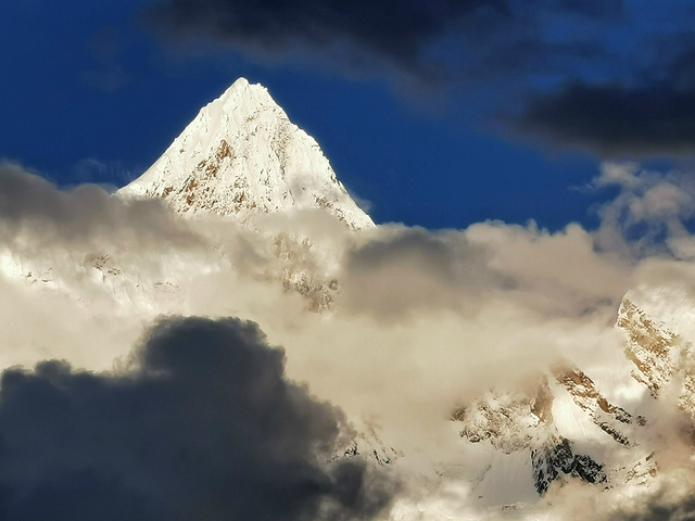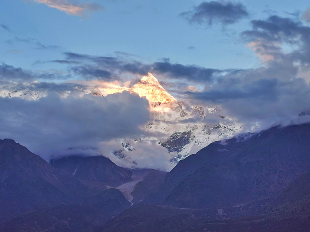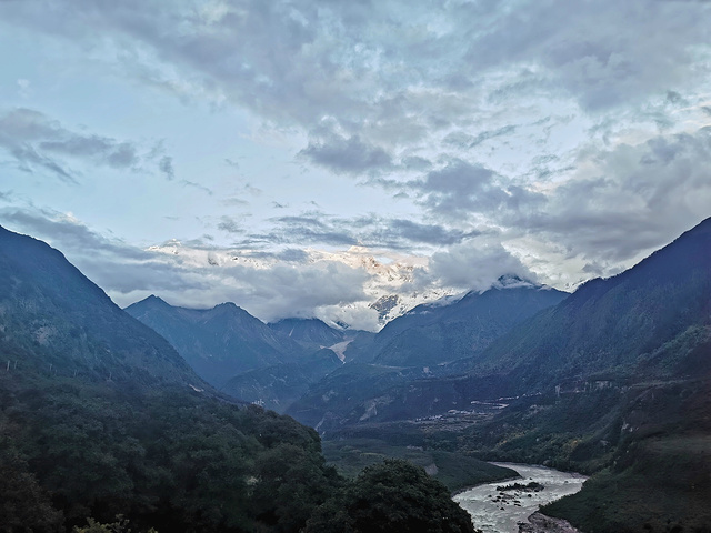 远处就是南迦巴瓦峰,偏偏云彩飘过,山峰顶若隐若现。