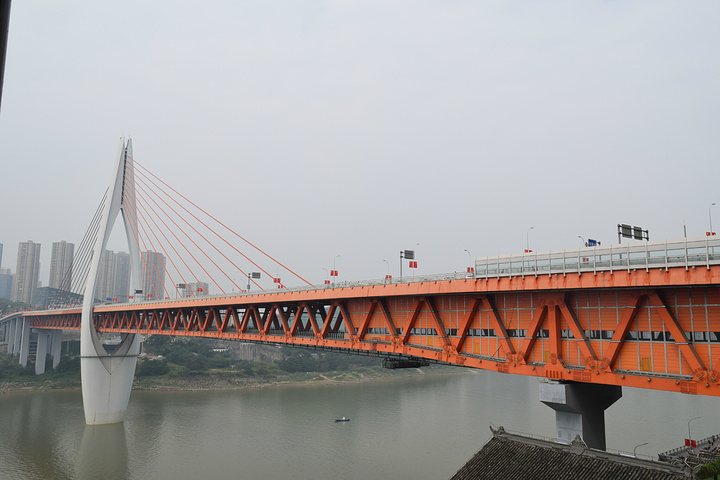 站在传统的吊脚楼前看现代的跨江大桥,感叹建筑的对比和惊奇。