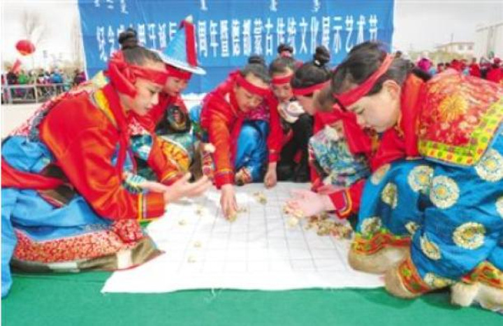 ①益智游戏:将智力活动与娱乐活动巧妙地结合起来进行的游戏形式,主要有拼图类和棋艺类。如:蒙古象棋、狼吃羊、“宝嘎”、“帕日吉”、“吉日格”(鹿连儿)、大六牌(股牌)、“连环锁”。