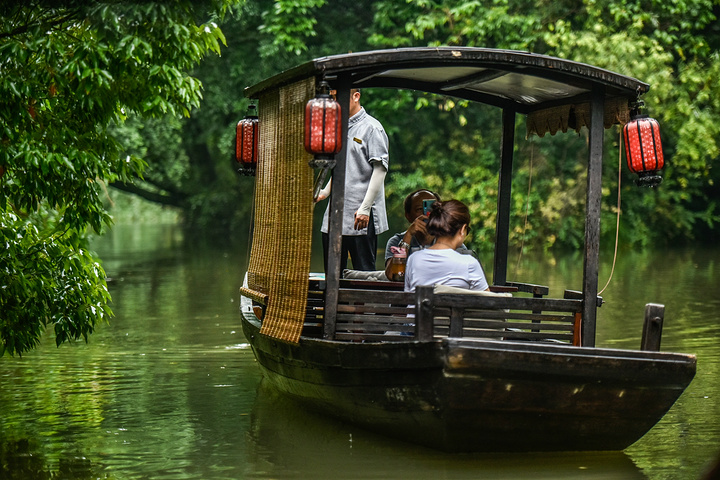 如何去杭州西溪湿地感受西溪且留下这种意境呢?我有个比较不错的方式,那就是选择乘橹船吃下午茶,一边欣赏湿地美景一边感受这种气息。故而,山野君我就选择了西溪湿地悦榕庄的橹船下午茶来模拟葛优在当时的场景,一般都能感受到这种意境。