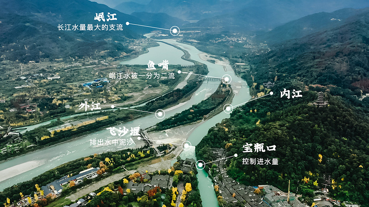 汹涌湍急的岷江经过【鱼嘴】,就被分水导流了。岷江被一分为二,即 内江 (供 成都 平原的灌区使用)和外江(汇入岷江,后汇入长江)。