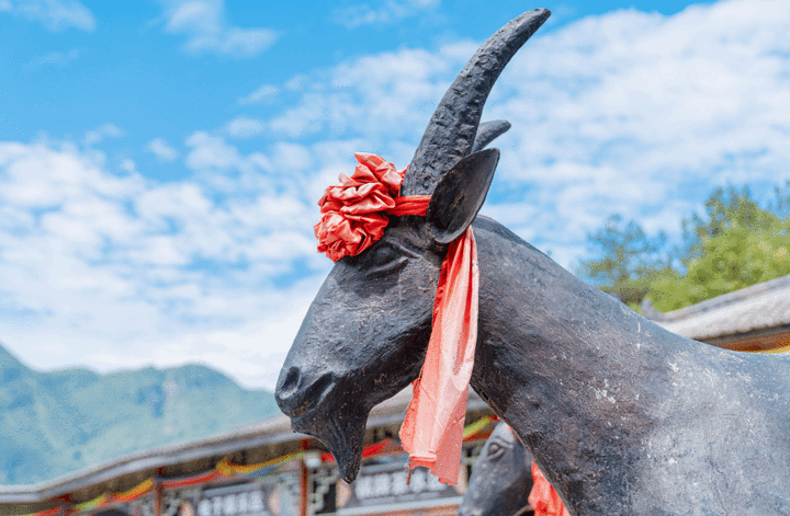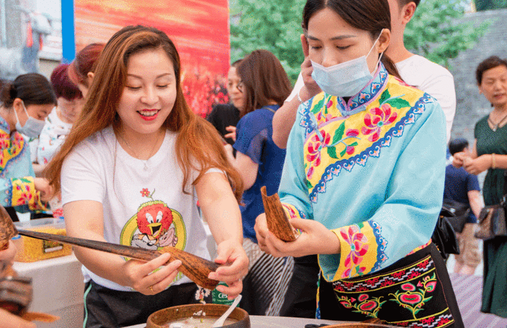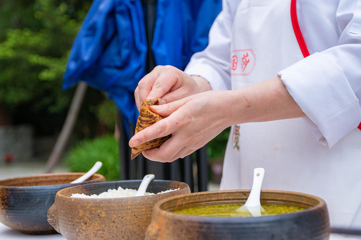 身穿羌族服装的工作人员小姐姐看我们站在那里,有点不知道往哪里走,很贴心前来询问我们,还告诉我们,端午节景点推出了“包粽子”活动,每天还是限量的,我们都只吃过蛋糕店,超市买那种真空粽子,想到这种自己亲手包粽子还是第一次,马上就去参加了。羌族小姐姐先进行了简单的讲解,怎么包,还当场给我们示范。看起来还是简单,觉得自己会。但是!真的打脸了奥~(脑子告诉我,我会!手告诉我,不!你不会!)粽子的味道还很多,口味有:红豆水晶粽,金丝蜜枣粽,咸蛋黄肉粽,泡椒牛肉粽!我当时纠结了好久哦,我都喜欢吃,都想要,哈哈哈哈。纠结之下,我还是选择了红豆的,哈哈哈哈,还是想要甜甜的粽子!拿着那个粽子叶,先把它弄成一个倒三角的样子,中空。再接着放米,再包的严严实实的,最后捆上绳子。最后这一步,实在是太难了,捆的不紧,煮出来的粽子就没办法吃啦,就浪费掉了,我弄了好多次,还是不行,还是求助了食堂阿姨。包好之后,还贴心的问我们是需要直接带生粽子走,还是可以现场吃的熟粽子。像我这种爱吃鬼,当然是选择带熟粽子啊!