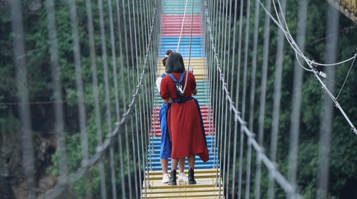 第二个玩的就是云中漫步。才从悬崖秋千下来,双腿还在打抖抖哈哈哈哈,我实在是不敢去玩,但是,在朋友的怂恿下,我还是去了,哈哈哈哈哈,就十几米长的路,我在上面鬼哭狼嚎,十几分钟。真的,有点,丢人~~