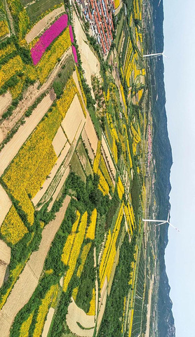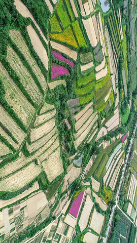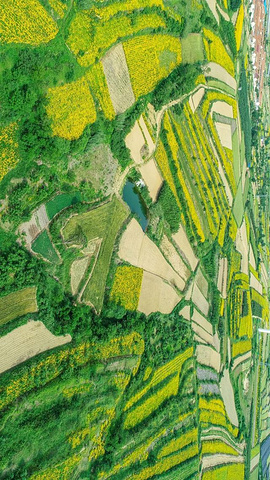 明丽抢眼的黄灿灿和小麦田、石竹、池塘等组成颜色各异的梯田。