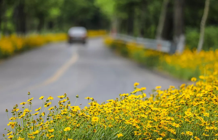 在崖西到埠柳的县道边就开满了这样的野花,蜿蜒曲折的穿山公路,犹如一条金黄色的缎带,镶嵌在郁郁葱葱的山林间,成为一道亮丽的风景线。