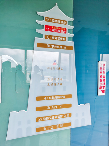 建筑物1楼设计为珲春数字展览馆,2楼为防川历史博物馆,3楼特设纪念品店、咖啡厅、电子影像合影空间、服务台及售票处、电梯等候厅等,4楼为东北虎展览馆,9楼为休息空间、情侣商品展示陈列区、时尚商品馆、珲春防川纪念品展示陈列区、收银台及合影照片领取处,10楼则为露天瞭望台、迷你留言板展示区,11楼是360度室内观光区(设有电子望远镜、电子玻璃景点介绍)等,12楼是贵宾区。
