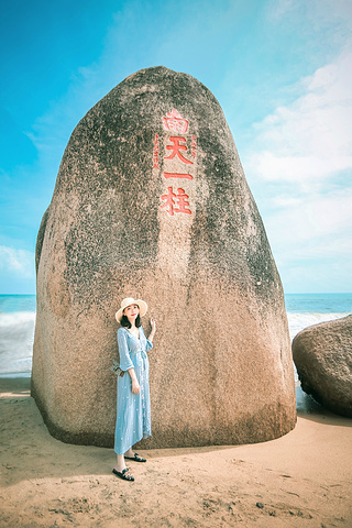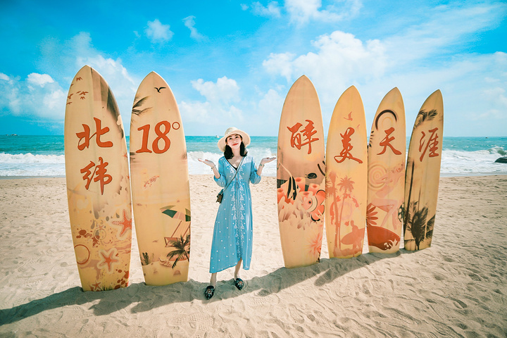 在天涯石的旁边还有一处拍摄点,虽然不是紧挨着天涯石,但却有天涯石作为背景。旁边还有一处冲浪板的拍摄点,写着“北纬18°醉美天涯”。这两个点都是景区的官方拍摄点,可以凭门票免费拍摄照片,然后去指定的地方免费领取,不要白不要嘛!