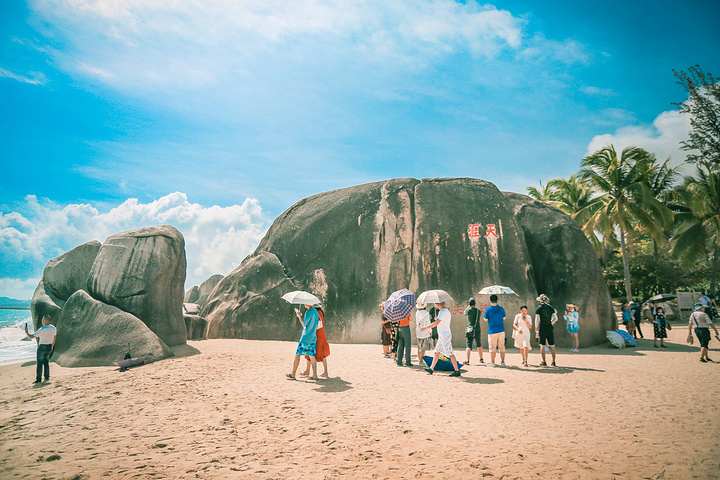 搭乘景区游览车,车游了一下其他景点,然后在南天一柱下车,步行漫步沙滩,大约走两百米左右就到了天涯海角石,最后在天涯海角石坐游览车返回。