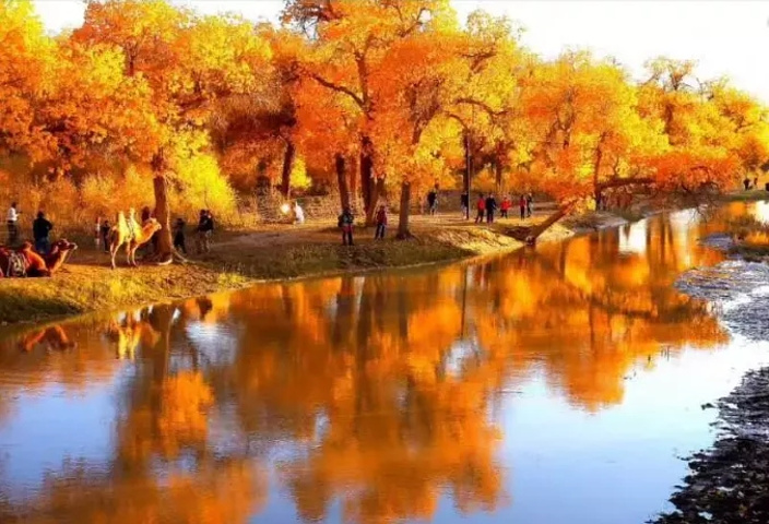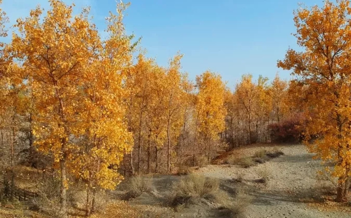 湖泊与沙海的中心,分布着片片胡杨林,放眼望去,天空湛蓝,大漠浩瀚,金色的胡杨漫延天际,景观美丽又震撼。来访游客不仅可感受鬼斧神工的大自然壮美,还可领略胡杨树磅礴向上的气势和不屈不挠的精神。