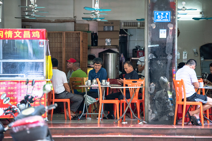 走着走着,还看到好几家“茶馆”,坐满了当地爷们!难道这就是传说中的“海南老爸茶”吗?是的!这是海南男人专属的生活方式。有点儿类似于江南周庄水乡的阿婆茶,几个相识好友,在空闲时间,点上一壶茶,来上几个小食,相谈甚欢,悠哉悠哉一下午。但是外人只看到悠闲生活的表面,却看不到文化的精髓。在海南,尤其是三亚,男人都是靠出海打渔为生,一出门就是十天半个月甚至更久。而危机四伏的大海,总叫家里的另一半担心。所以,历经乘风破浪、平安返航的男人们,到家后,女人们总舍不得他们继续操持家中事务,任凭他们休养、悠闲度日,所以久而久之才有了老爸茶这一地方特色。不过现如今,打渔逐渐衰落。而年轻人也在这喝老爸茶,则会被视为好吃懒做、游手好闲。因此,你看到的基本都是四五十岁的大叔。