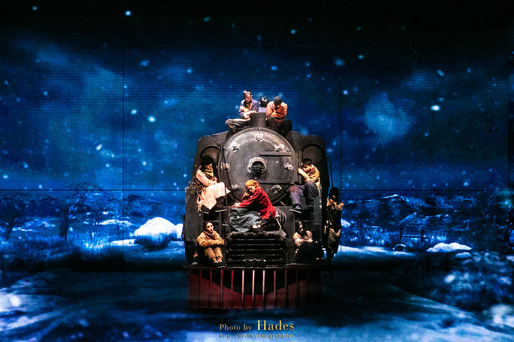 汽笛声声,蒸汽火车从舞台中呼啸驶出。本以为这逼真的火车头是全息投影,当车上的演员走下来,才恍然大悟,这巨大的火车头居然是个真家伙!