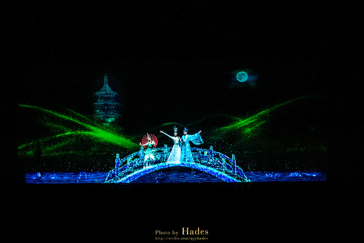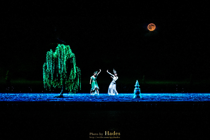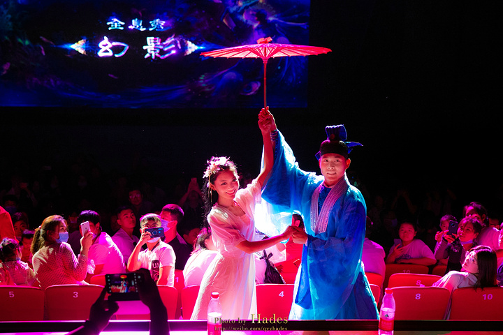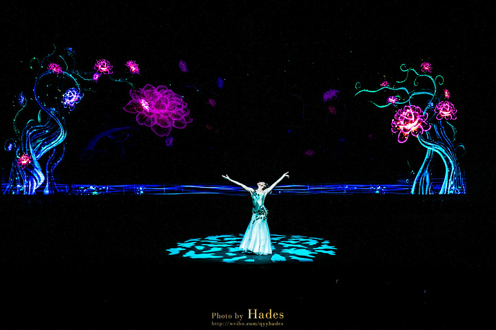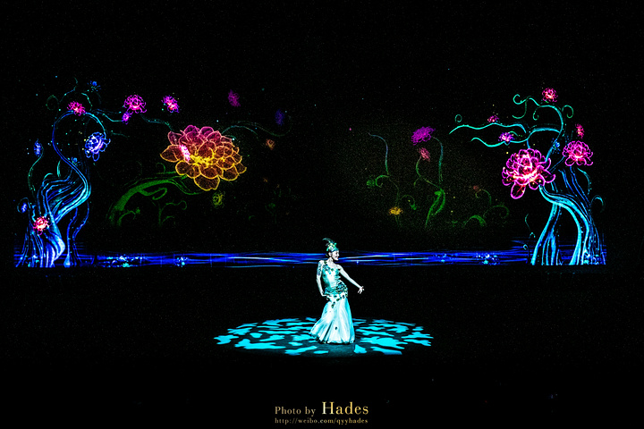 《幻影》演出时长17分钟,运用全息投影技术,将实景演出与虚拟画面相结合,营造出如梦似幻的视觉影象。
