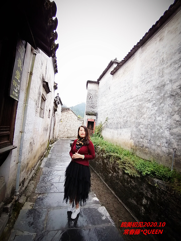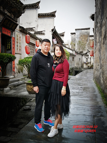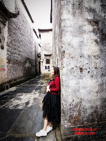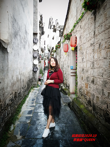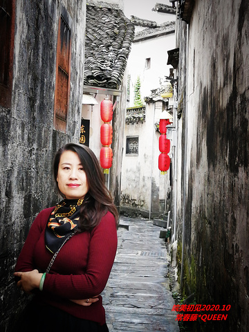 西递的清晨,是绝对的不能错过。昨夜的一场小雨,让古村清新而又静谧。斑驳的灰墙被雨水冲刷的像是刚刚粉饰过的,红色的大灯笼更加的艳丽,是在欢迎我的到来嘛!?清晨的六点多钟,村中行人稀少,商贩的摊位还没有展开,少了白天繁华的景象,没了错身而过的游客。只有我俩游荡在熟悉的街巷中(昨天已经逛了一遍),拿起手机尽情的拍照,大大的满足了欲望。很遗憾,此次匆忙的出行忘记带上喜爱的旗袍,欣喜的是今天穿的酒红色上衣,置身这灰墙黛瓦中很应景,拍的照片色调非常完美,被自己惊艳到了!有木有,有木有?哈哈。。。大笑。。。