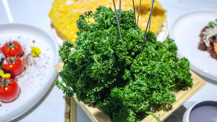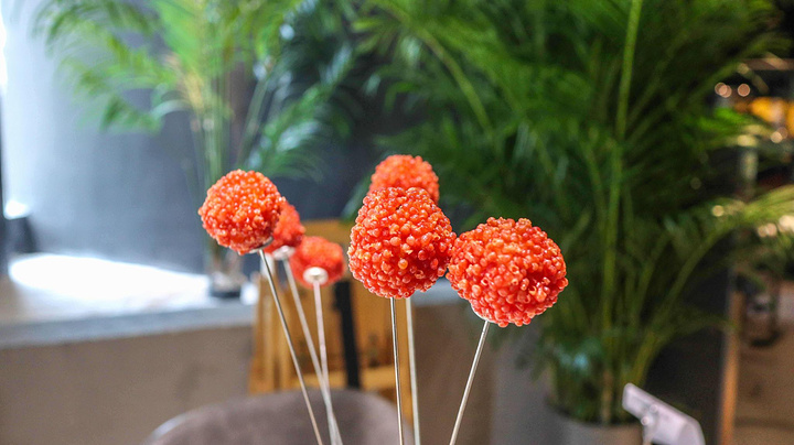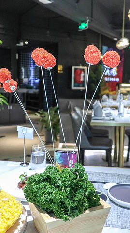 我最喜欢这道菜了,造型独特,像一个花盆,下面都是真的时蔬打造出绿植的造型,虾球插在一根根长条棒上,油炸的虾球,外酥里嫩,虾仁已经做成虾泥,但是依旧可以吃出虾的鲜味来。