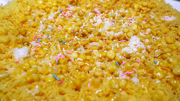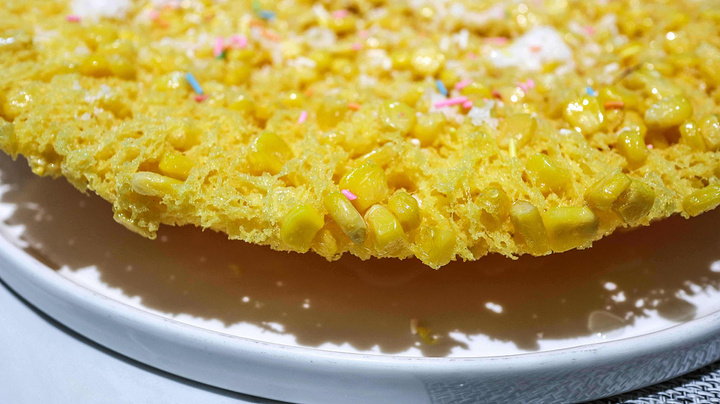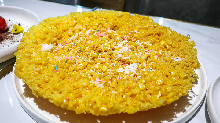 特别大的一份菜,黄彤彤的,下面是炸的脆脆的,造型如珊瑚一样,玉米粒铺在上面一层,再有白砂糖点缀,个人觉得这道菜甜度差一些,口味再甜一些更好吃,但是造型给满分。