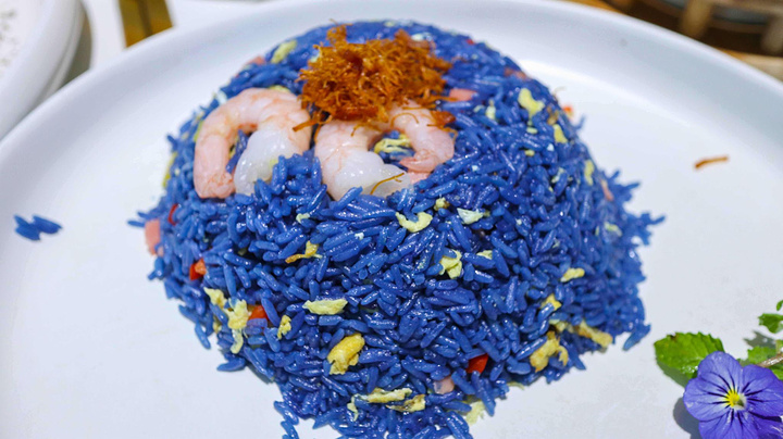 如海洋一般的湛蓝,让普通的米饭也有了浪漫的色彩,上面还点缀两个大虾仁,味道清淡,但是颜色就特别的有食欲。