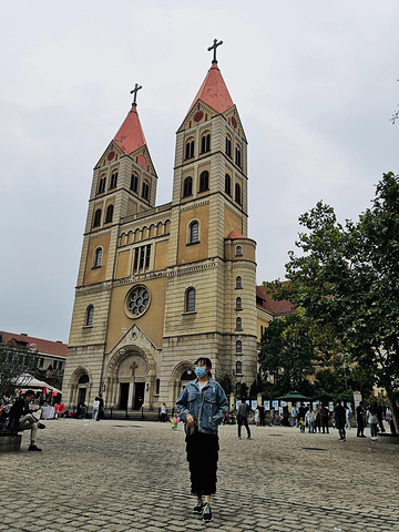 (⊙o⊙)…,我们可能是错峰出行到这里的缘故吧,人不多,由于不信教,也出国参过教堂,所以并没有买票进入室内参观。不过从外面往里看,黑黑的,不亮堂。教堂位于一个广场上,有些经典的兜售之物。这个广场不大,而且有很多岔路。不过,从远处拍这个教堂,效果还是不错的。也遇到了一对拍摄婚纱照的新人,似乎这种西式风格的地方总能遇到婚纱摄影的。