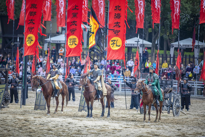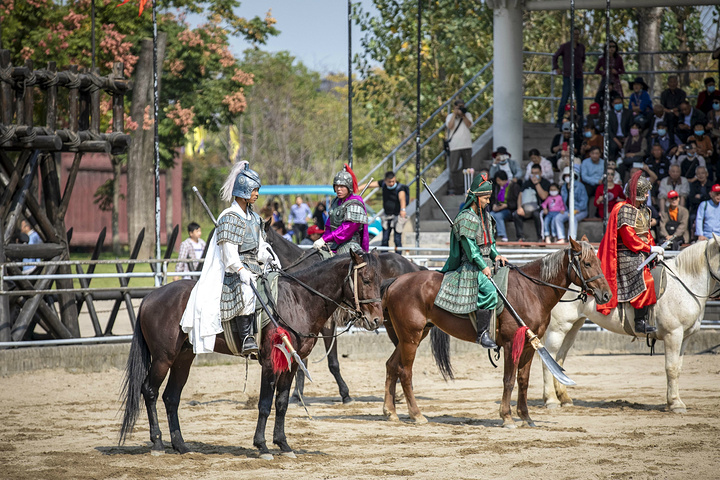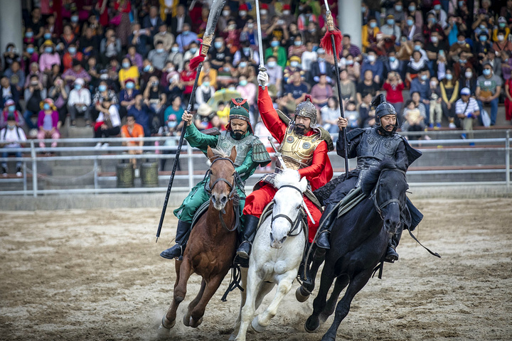 《三英战吕布》,再现真实战争场景,演员们骑在马背上刀枪剑戟打斗的正酣,其场面宏阔,真实生动,演员们入戏很深,一招一式都展示着扎实的武术功底和表演实力,引得现场观看演出的游客发出连连的欢呼声和感叹声。