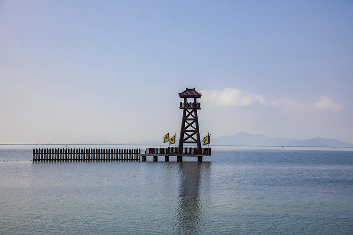 此地就是当年拍摄火烧 赤壁 的地方,曹操因被周瑜离间计,错失了仅有的两位懂水战的将军,将纯木结构的舰船首尾相连,自此北方的士兵再也不会晕船,但随之而来的却是一荣俱荣,一损俱损,顷刻间火光冲天,那番情景是何等的壮观。不过风雨过后的水面又是如此的平静,夕 阳西 下,存留的寨门在 太湖 水中矗立成为一幅剪影。