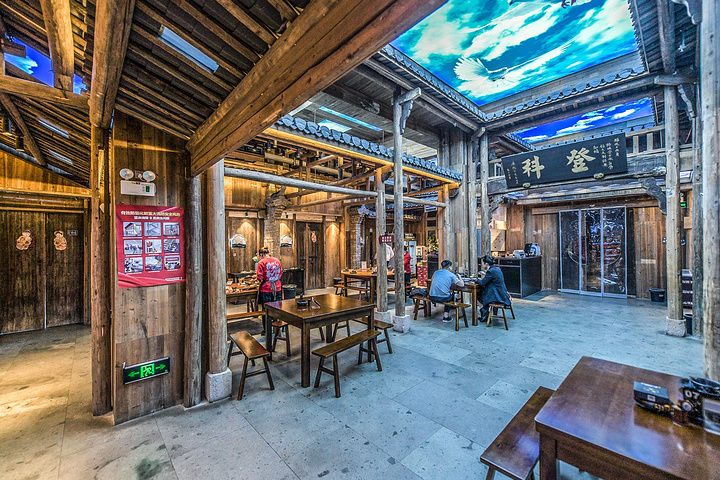 餐厅内部的装修与构造全部都以木质材料为主,并在建筑重心点以石材为辅助。营造出古色古香的徽州人家的气息,在这种环境下就餐,感觉肯定不一样了。