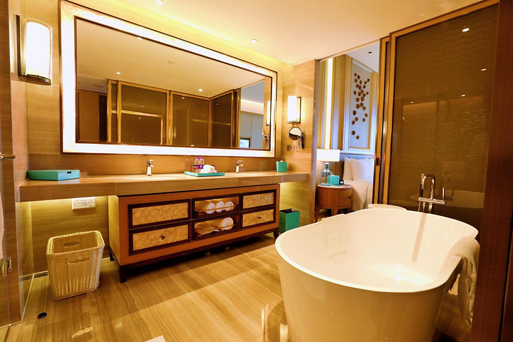 酒店的大堂很气派,暖黄色的灯光给人以温馨的感觉,极具特色的玻璃幕墙在光线的照射下,很是精致。在大堂外,有一个半露天的吧台,在这里坐着便能直接看到大海,没事的时候就可以在这里喝喝咖啡,看看书,或者品尝一下法式下午茶,拍拍照。