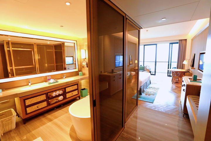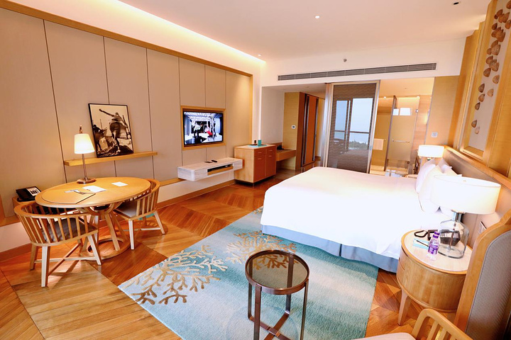 预订的客房是行政海景房,房间内饰采用原木自然基调色,配以热带海洋元素的地毯及淡雅的窗帘,整个房间看来特别的清新舒适。蓝色的地毯和地毯上的珊瑚图案算是房间中最亮眼的海洋元素,珊瑚绽放得充满张力,意寓茁壮成长。
