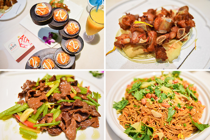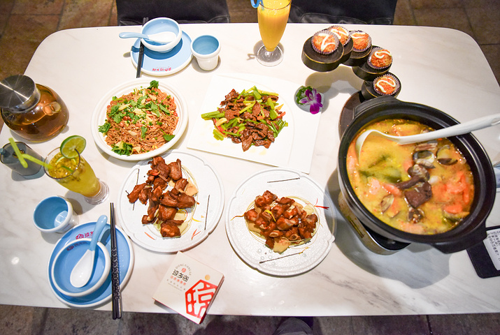 餐厅最近比较热门的菜式,海南必吃海鲜糟粕醋火锅,糟粕醋是海南文昌市铺前镇传统小吃,主要是酒糟发酵醋酸作为汤料,微辣酸甜开胃,再加入虾、贝壳、海菜等菜式,口感更鲜美。尤其是秋冬滋补季,美容养颜的它颇受女性喜爱。孜然海南东山羊小排,海南万宁东山羊,国家农产品地理标志,皮薄肉嫩,无膻味,经过传统方法烹饪后,肥而不腻。而用孜然调味后的羊排,更是外酥里嫩,金黄色,更诱人。步步高升虾球,采用当地海鲜虾肉制成,摆盘造型很别致,趁热食用,味道更佳。海南香芹爆炒黄牛肉,源自五指山的小黄牛,肉质也很嫩。定安黑猪肉排骨,肉质紧实。招牌海南粉,作为特色小吃,也是主食,天气炎热,凉拌更开胃。