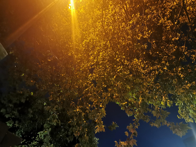 夜晚灯光照射下的枫叶
