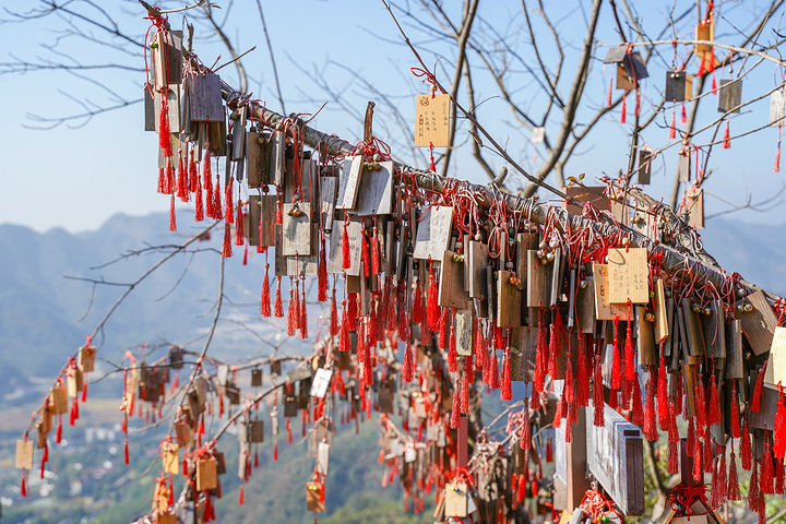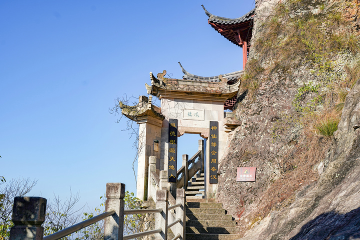 拾着青石台阶逐级而上,走过牌坊继续往上就来到了能为我们省不少力的索道,上了索道,渐渐能看清山口的全貌,远处的翠绿山峦倒影在这天际也显出几分蓝调,这山、这水、这天还真是让人心旷神怡。