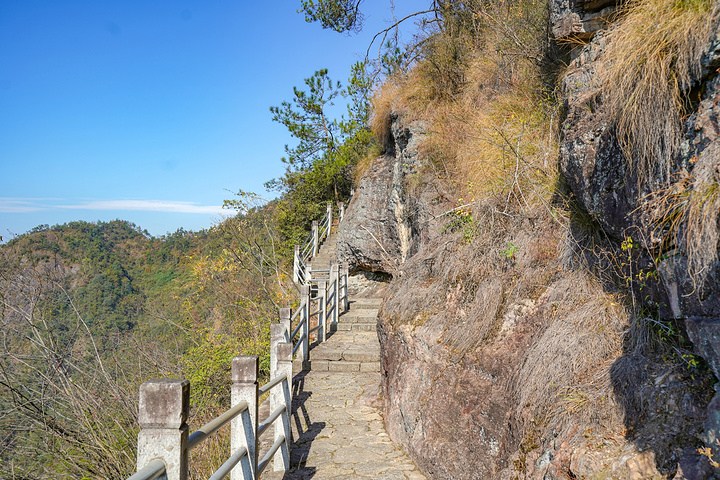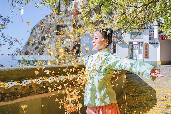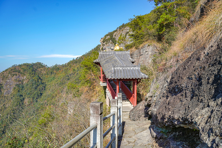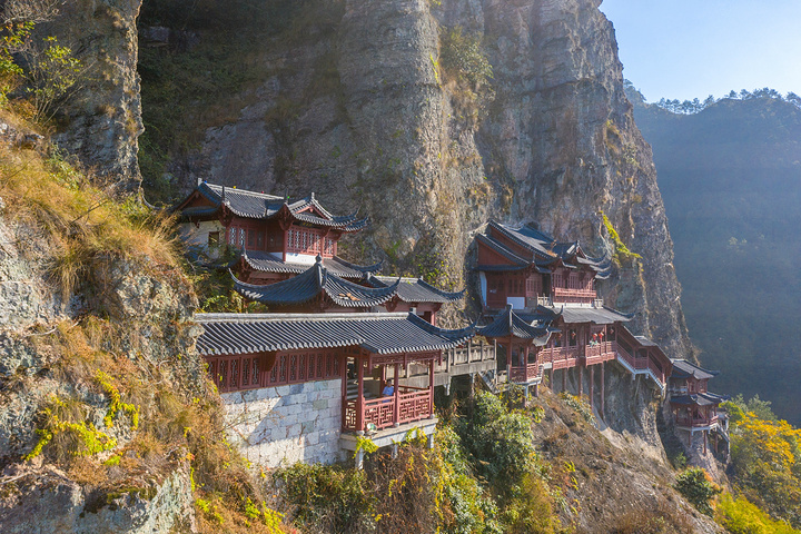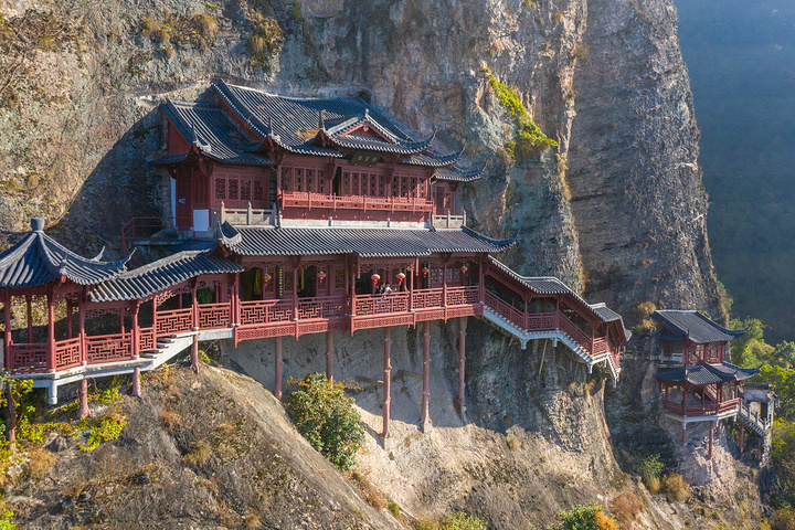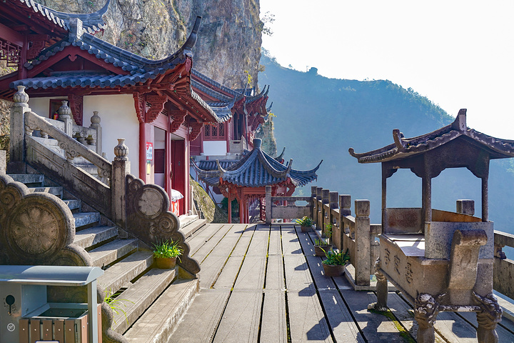 此处的悬空寺与山西恒山悬空寺有异曲同工之妙,主殿为地藏王大殿,依山而建高3米,长60米,它一半嵌入岩腹,一半悬于半空,十分壮观,立在主殿驻目望去,远处的山峦河川尽收眼底,飘飘然竟有种俯瞰天下的感觉。