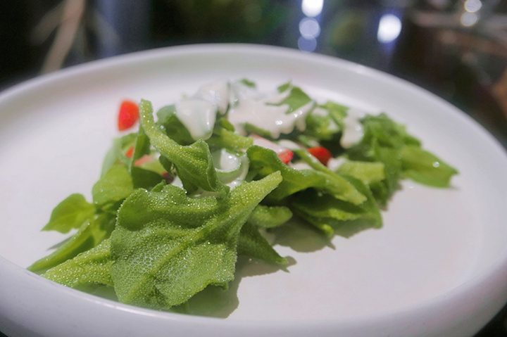 冰草沙拉:色泽翠绿,上面分布着晶莹剔透的小水珠,淡淡的咸味混着清香,冰爽鲜嫩。