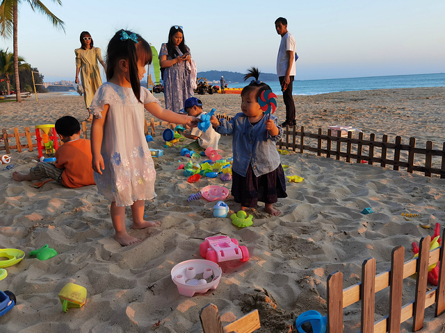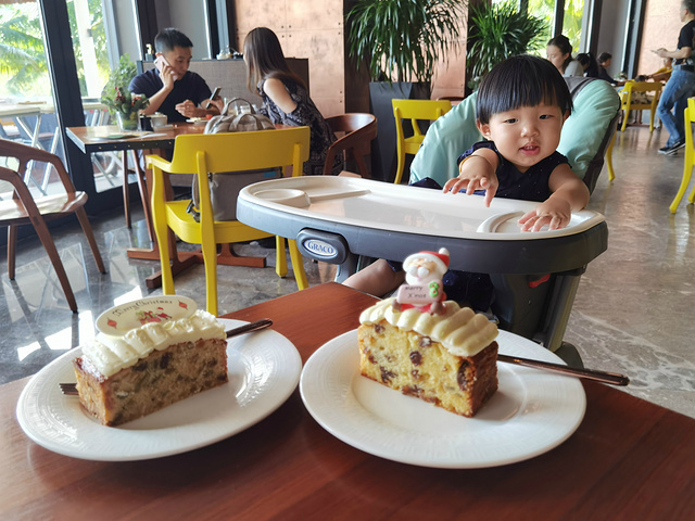 这个房间确实不错,有88房,关于房间的介绍可以参考我嫲的另一篇笔记,我可说不清楚。我嫲说,3000块的房费可不止是这个房间,酒店里还有不少免费又高质量的活动。一定要一一打卡。于是我们三点睡醒午觉后就来到了丝路餐厅吃下午茶,12月圣诞季,给我们的蛋糕是圣诞主题的蛋糕,我没得吃,也没逃过被我嫲当拍照背景的命运。当然了,他们吃蛋糕的时候也给我安排了米饼,我也享受了一起下午茶的闲暇时光,据说这就是我嫲的日常,真是不能够更羡慕了。吃完下午茶我又去沙滩边走走,嫲说这里的沙子也不算细,究竟细的沙滩是啥样的,希望嫲下次能带我体验体验。这个酒店是沙滩又一块儿童区域,里面有很多挖沙工具,无奈我年纪尚小,还不太会玩,只能在大孩子边上看看过过眼瘾。等配合我嫲拍完落日照后差不多六点,我们就去参加这个酒店最有名的一个活动啦——入夜仪式。
