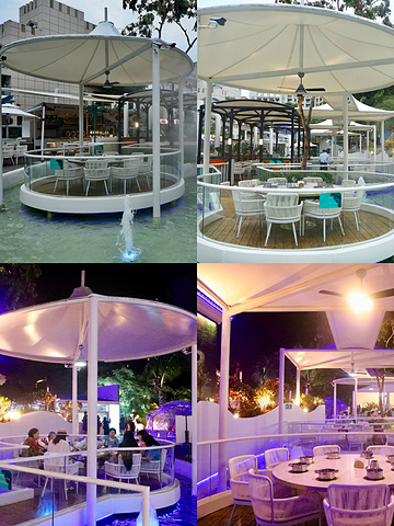 傍晚时分,在户外婆娑的椰影下,听着潺潺的流水声, 身边笼罩着朦胧的雾气,就像置身于热带雨林中……每一个角落里都弥漫着浪漫唯美的气息。带有星际球元素的透明遮罩将休息区与外界隔开,用餐环境甚是浪漫。餐厅以蓝白色为主色调,营造出海洋格调,仿佛一个梦幻的海底世界,是个约会吃饭的圣地,也很适合拍照。