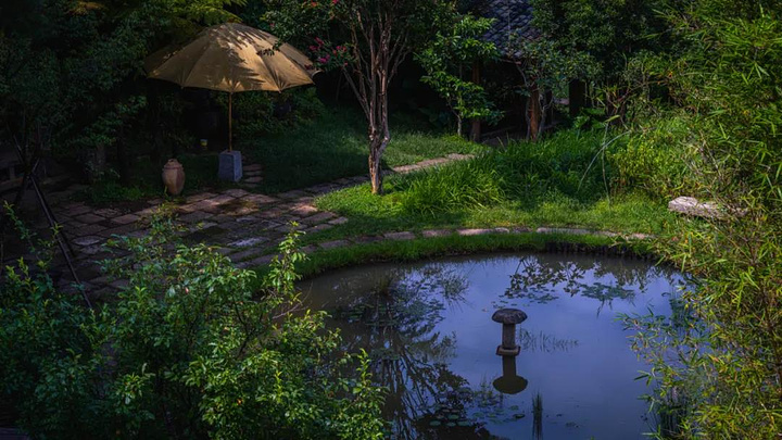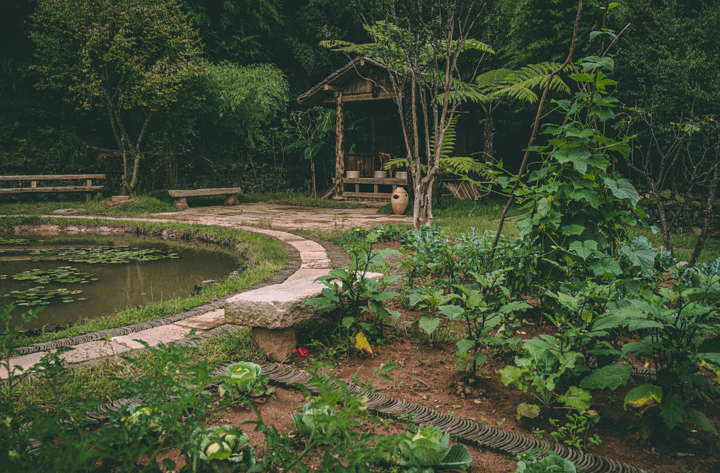 一座小小的菜园、一间下沉式的休憩小屋,门前简易的秋千和充满虫鸣蛙叫的池塘构建起田园生活怡然自得的模样。在三眼井旁打水、洗菜、洗衣,烧水,煮饭,日出而作日落而息,平静且安稳的日子,被这个小小的园子承载。