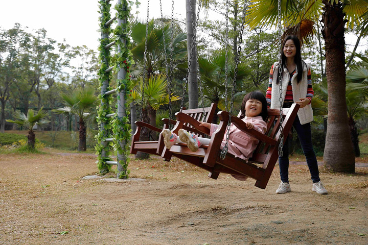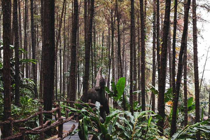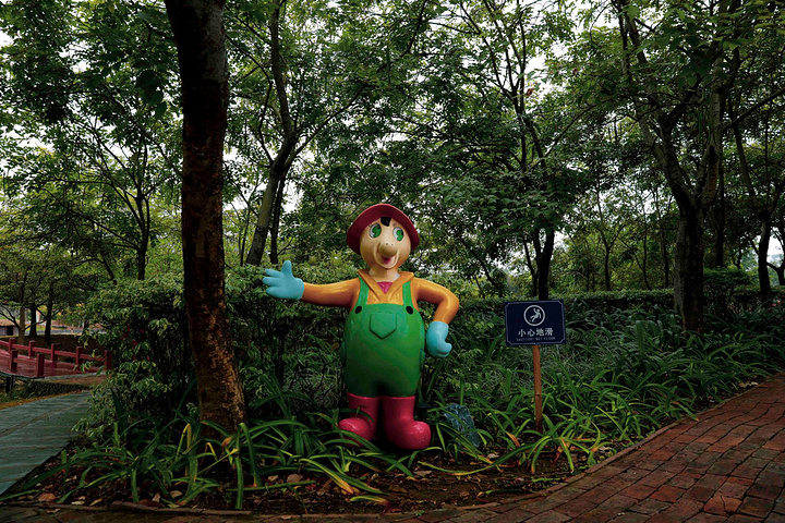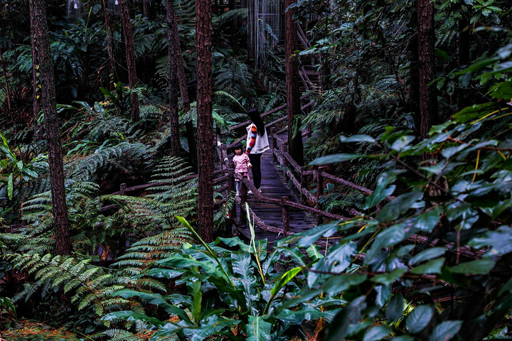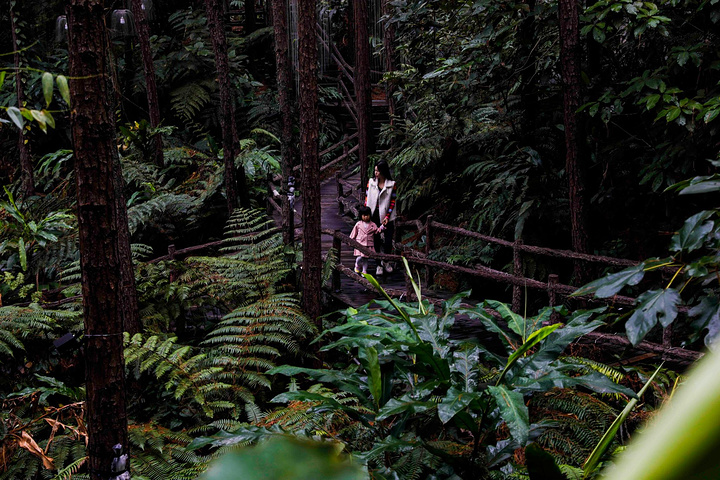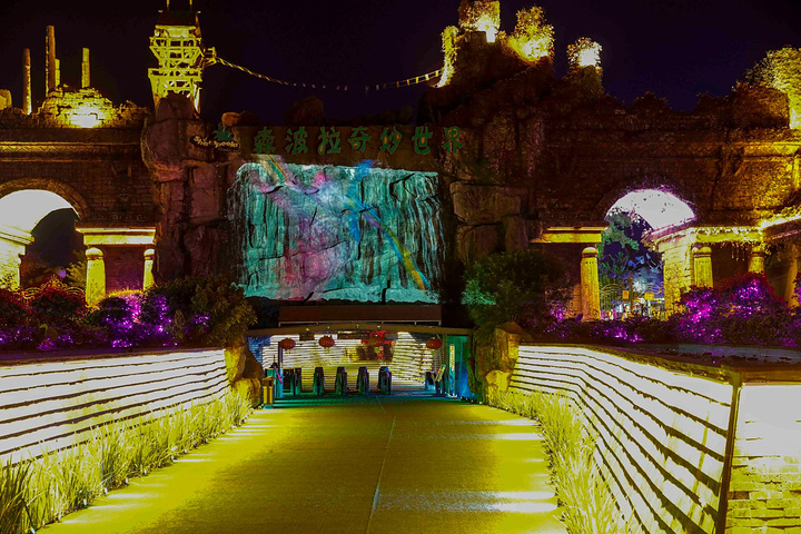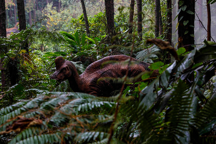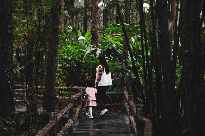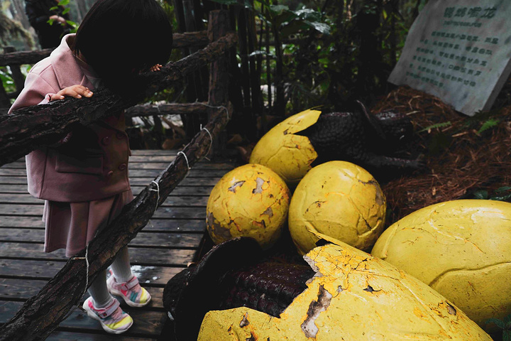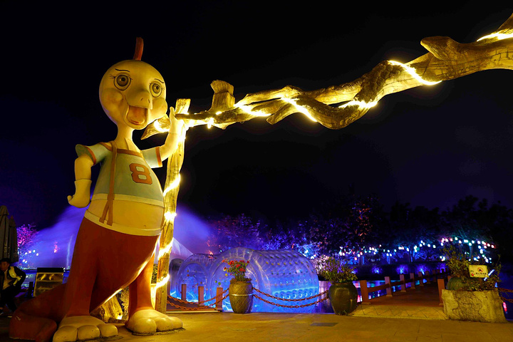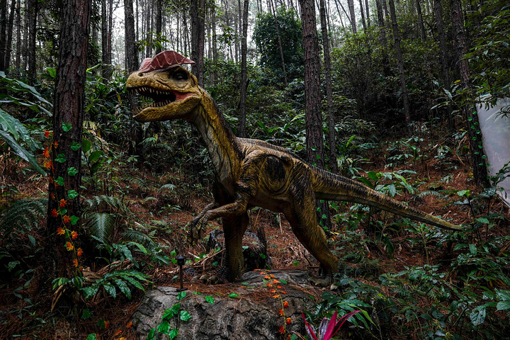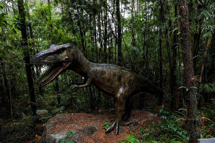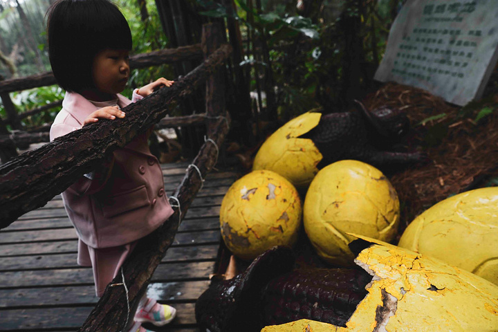 第二天,奇妙世界绝对不能错过。当你走近郁郁葱葱的远古森林,透过桫椤斑驳的阳光,走在依山而建的仿古木栈道,你可以零距离接触到仿真恐龙的雄姿。几十种、近百条大大小小恐龙的分散在雨林的各个角落,刹那间,你恍如回到了侏罗纪时代。整个恐龙谷占地大约有一百多亩,是华南最大的桫椤雨林恐龙王王国。