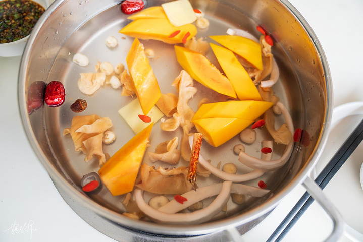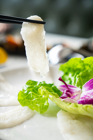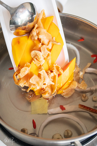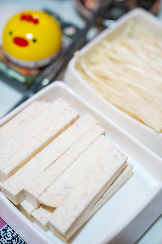 海南香芋,这个香芋和我们在家里看到的不太一样,很绵,煮久一点,入口即化。竹荪是所有配菜里面最爱的了,竹荪口感柔柔嫩嫩的,有点小脆,蘸上萌哒哒家的服务员调配好的酱料,好吃极了。