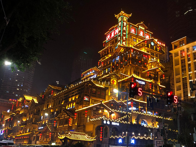 坐电梯到一楼,然后从大门出去,到马路对面,就可以看到洪崖洞的全景,也算是最佳的拍摄地点了。