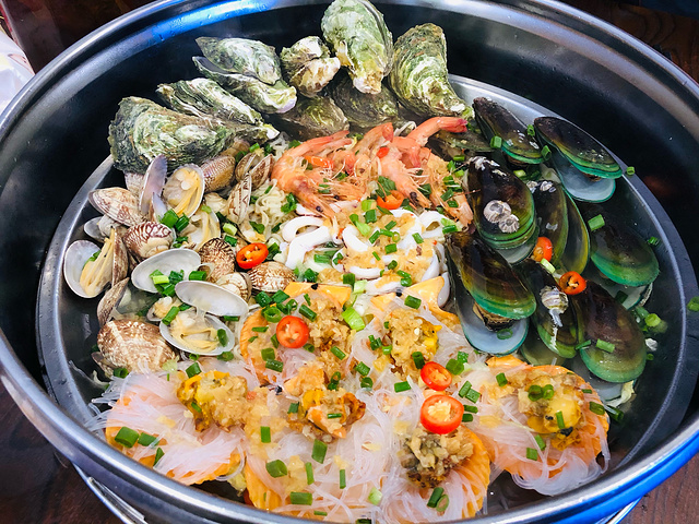 海鲜大咖,里面有生蚝,青口,蒜蓉粉丝蒸扇贝,虾,生蚝,花甲,鱿鱼圈,底下垫着金针菇,娃娃菜和类似面条的配菜,海鲜种类很丰富啦,量也很足👍