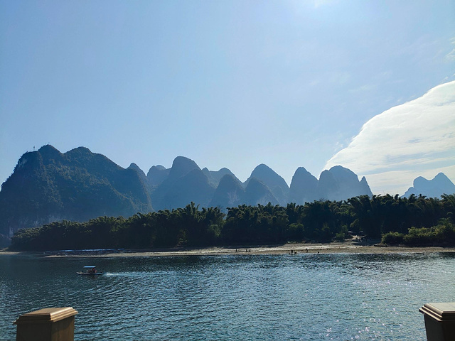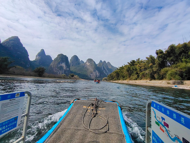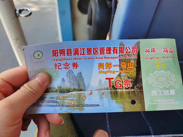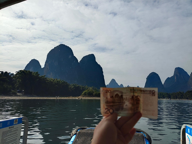 从岩洞内出来就直奔漓江也就是20元背景图上的地方,漓江的风景真的是很美,坐漓江的竹筏感受大自然的风光,一个竹筏是4人位,工作人员会帮助拼伐,如果不想拼就要补空位费,一个空位好像是35,坐在竹筏上感受两岸的山峰层峦叠嶂,黄布倒影等景色,漓江是最值得推荐的地方。