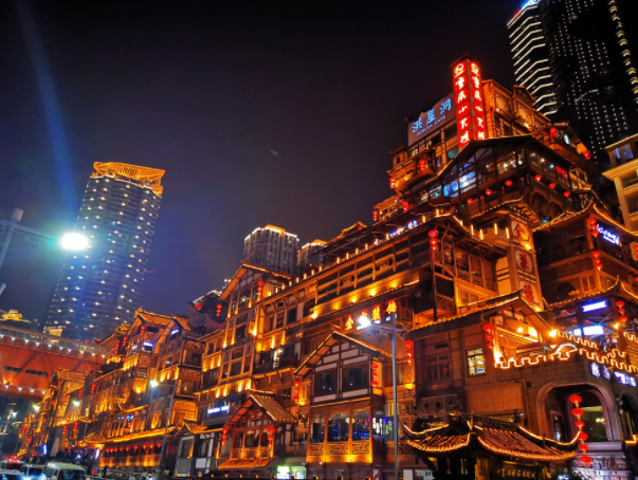 洪崖洞原名洪崖门,是古重庆城门之一,主要景点由吊脚楼、仿古商业街等景观组成,洪崖洞一共有11层,夜晚灯光从晚上6点开灯,10点熄灯。可望吊脚群楼观洪崖滴翠,逛山城老街赏巴渝文化,烫山城火锅看两江汇流,品天下美食。