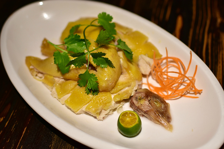 白切文昌阉鸡,最最最推荐就是这个鸡了,比较像广东白切鸡的做法,摆盘出来非常漂亮,外皮金黄,鸡肉紧致,蘸酱更好吃。